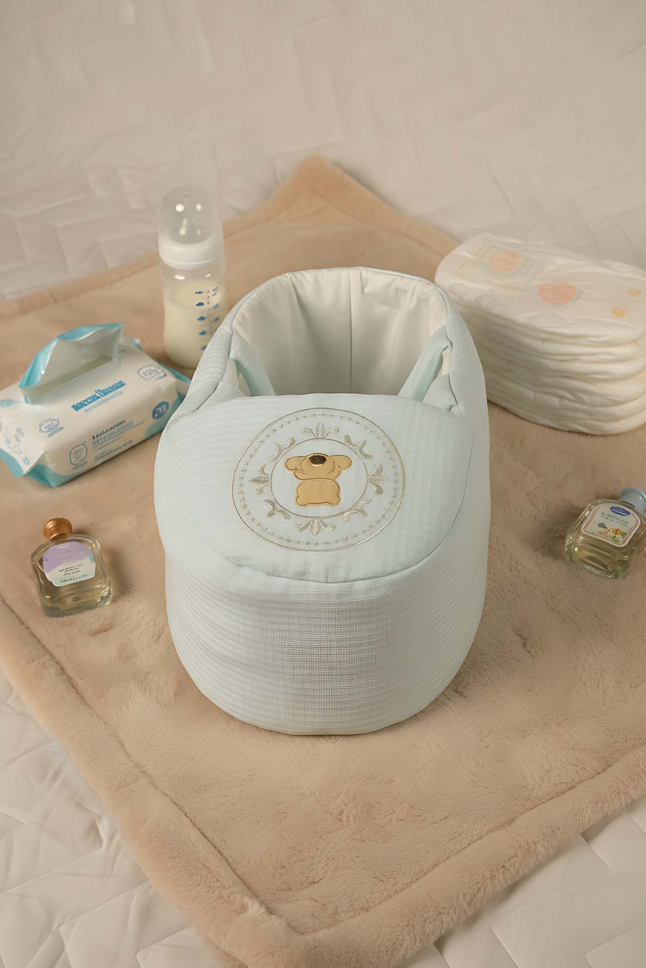 Pamuklu dış dokusu ile öne çıkan Bebek Taşıma Çantası, bebeğinizin konforunu ve güvenliğini bir arada sunar.