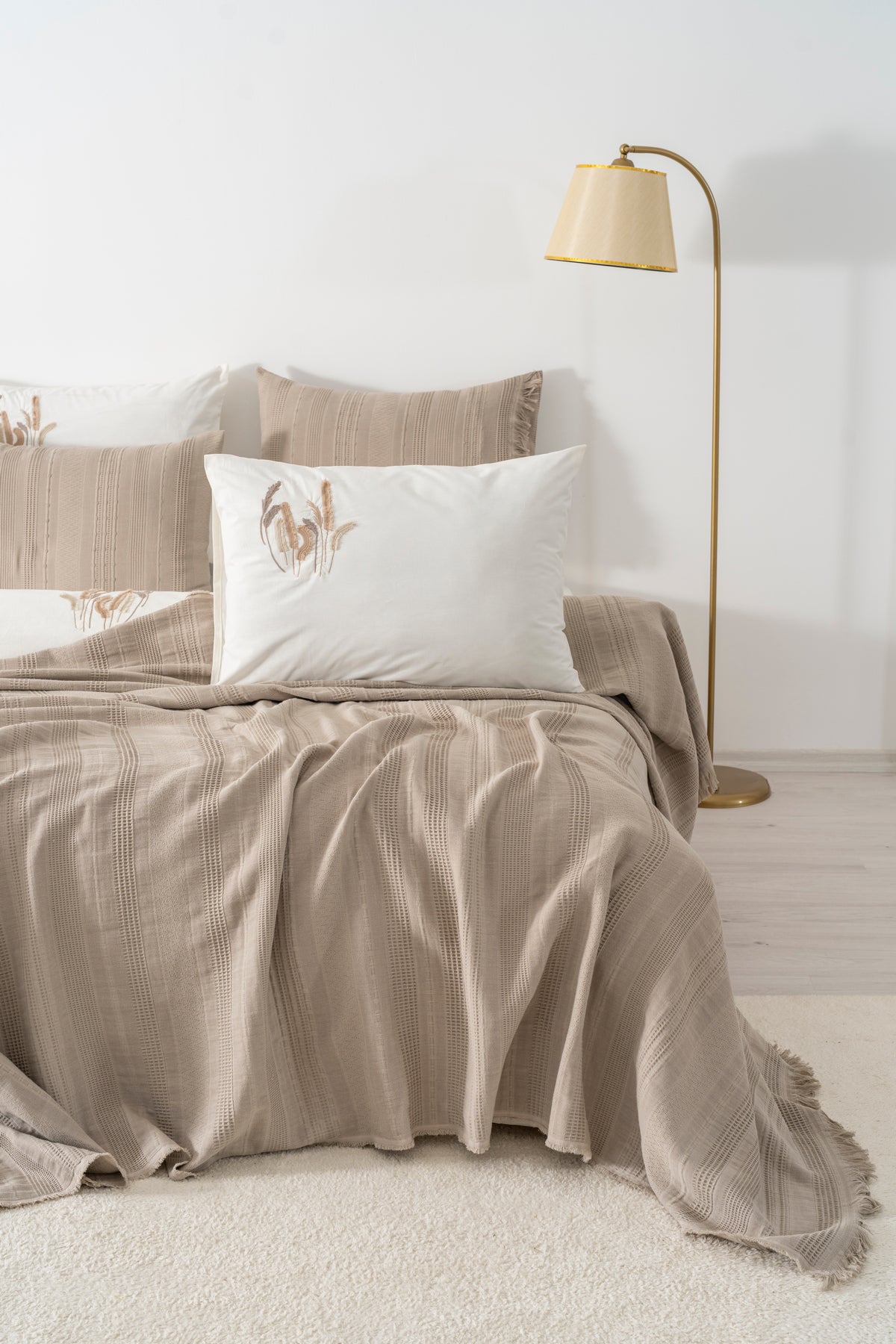 • Arya Vizon Nakışlı Çift Kişilik %100 Pamuklu Nevresimli Pike Seti - 7 Parça Çeyiz Seti