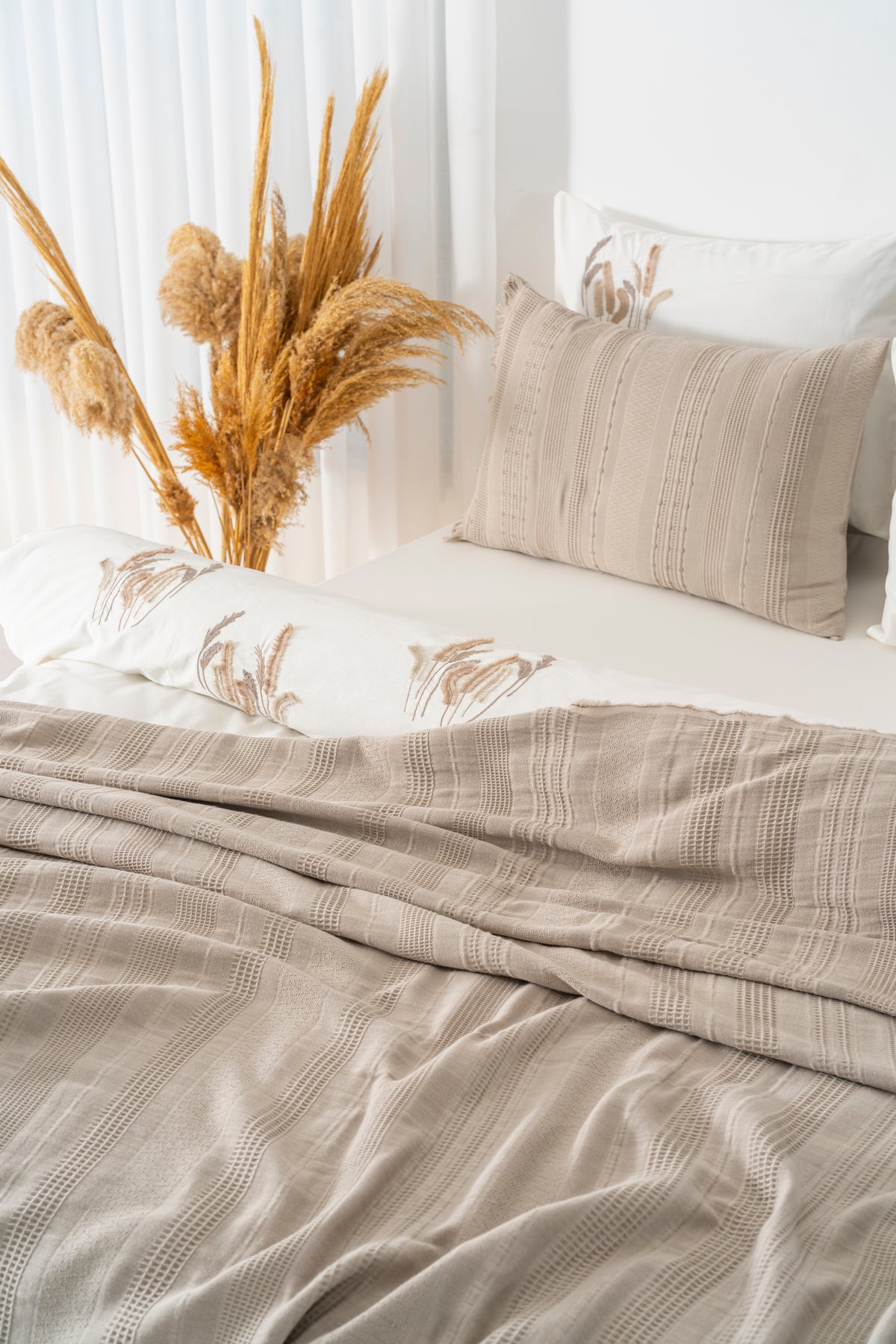 Sade ve şık görünümüyle her yatak odasına uyum sağlayan nakış desenleri, dekorasyonunuzla kolayca kombinlenebilir.