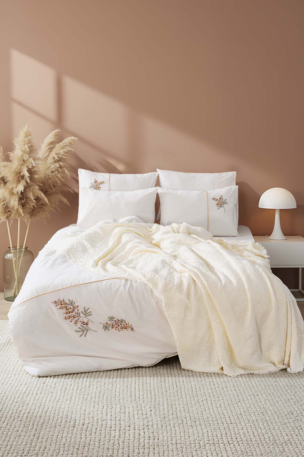 • Amber Ekru Nakışlı Çift Kişilik %100 Pamuklu Nevresimli Pike Seti - 7 Parça Çeyiz Seti