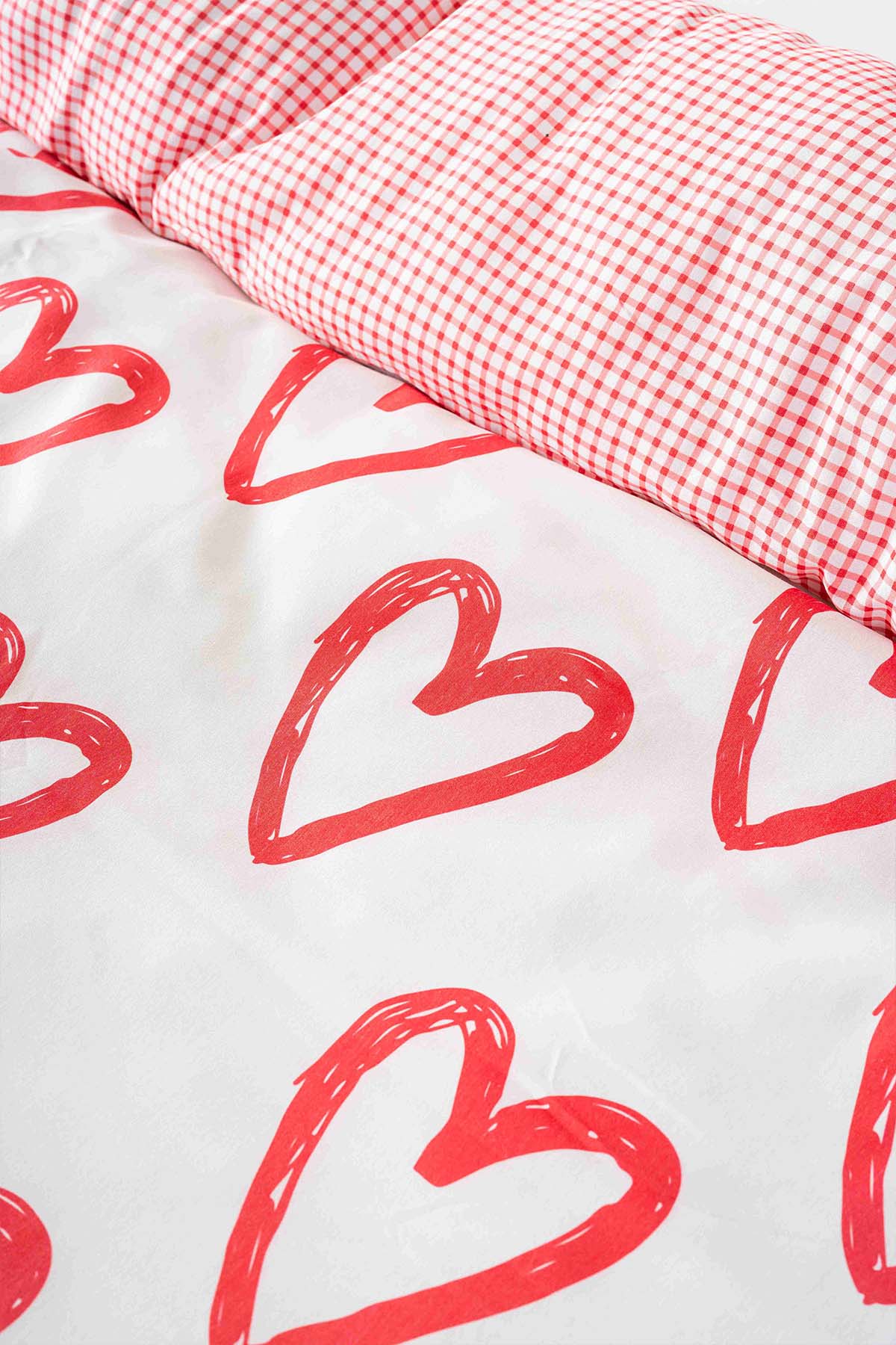 • Ekose Kırmızı Kalpler Çift Kişilik Outlet Nevresim Takımı Pamuklu
