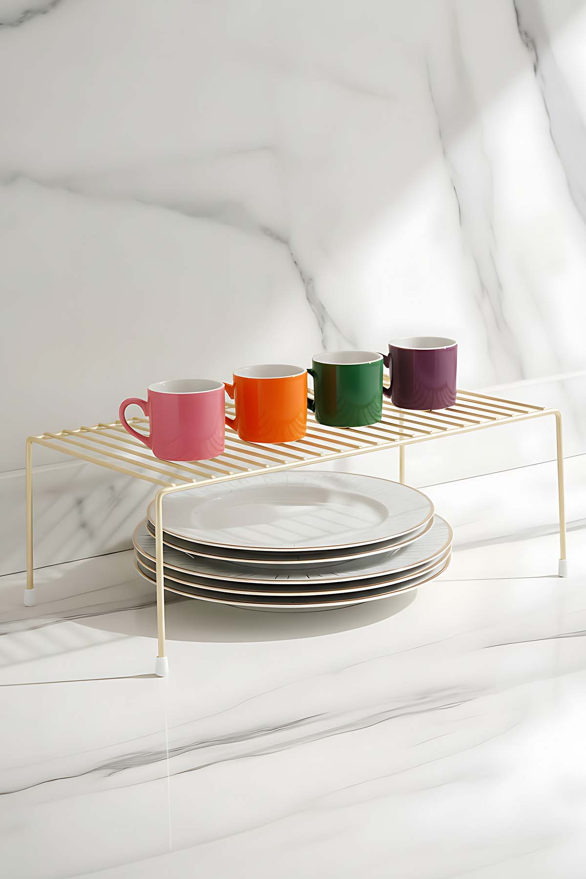 Şık altın rengi metal yapısıyla dikkat çeken Gold Çok Amaçlı Dolap İçi Düzenleyici, hem mutfak dolaplarında hem tezgâh üstünde ekstra alan oluşturmak için ideal bir çözümdür. Bardak, tabak, kavanoz, baharatlık veya çeşitli mutfak malzemelerini düzenli bir şekilde yerleştirmenizi sağlar. Sağlam metal gövdesi uzun ömürlü kullanım sunarken, modern ve minimal tasarımı her mutfak dekoruna uyum sağlar.