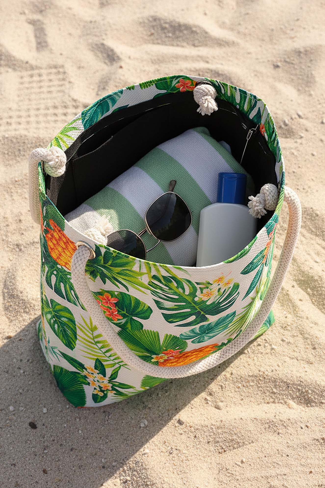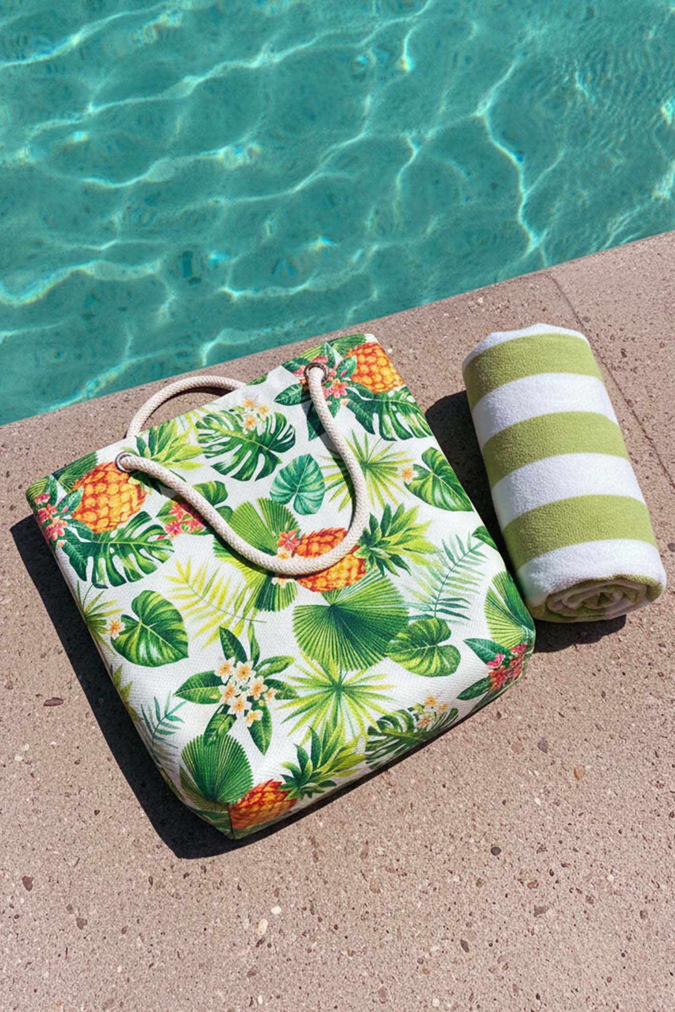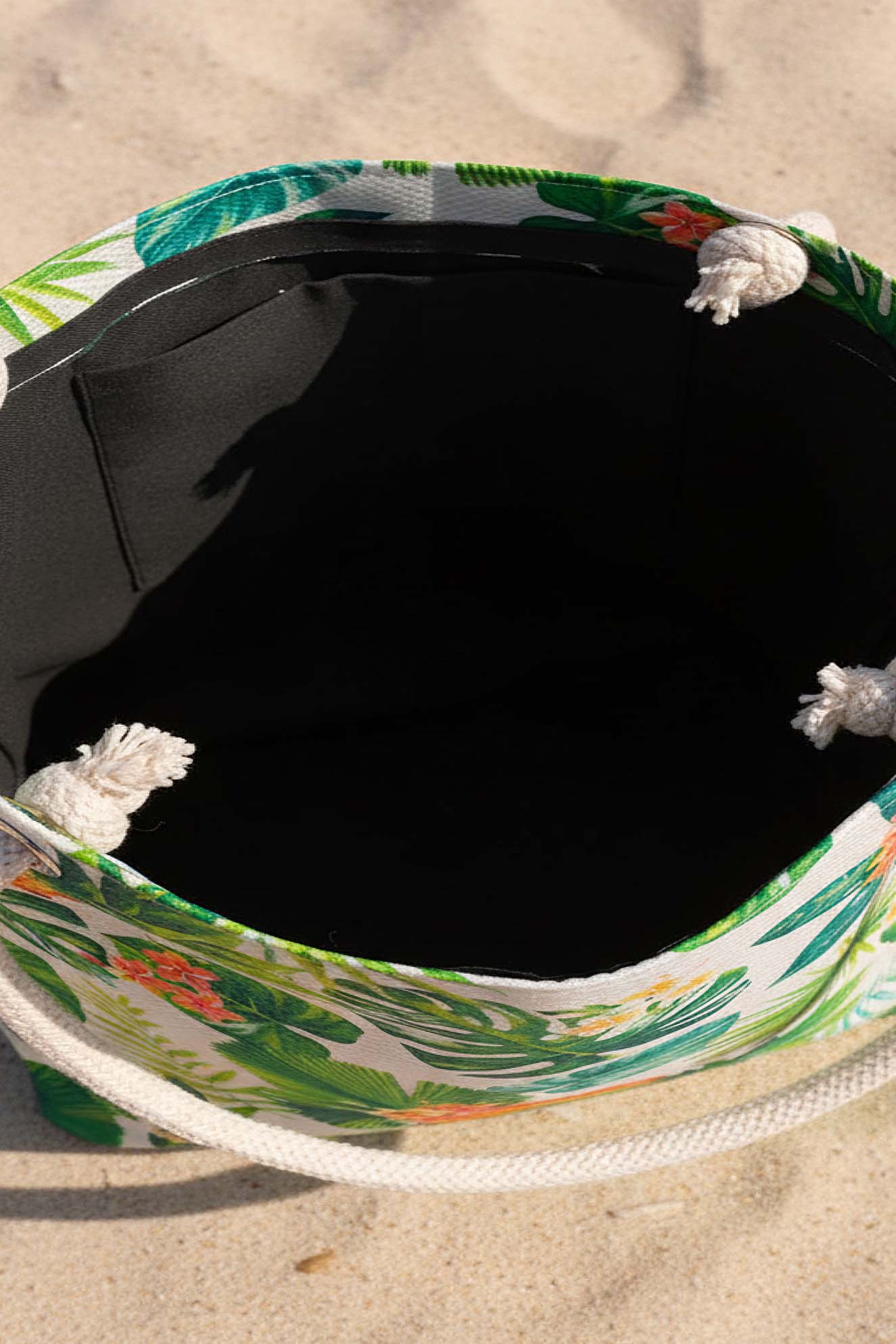 Dayanıklı Oxford su itici kumaştan üretilen plaj çantası, alt kısmındaki 100 gr teta laminasyon sayesinde formunu korur ve uzun süreli kullanım sunar. Ananas yaprak desenleri ve sağlam ip saplarıyla hem şık hem de kullanışlı bir plaj aksesuarıdır.