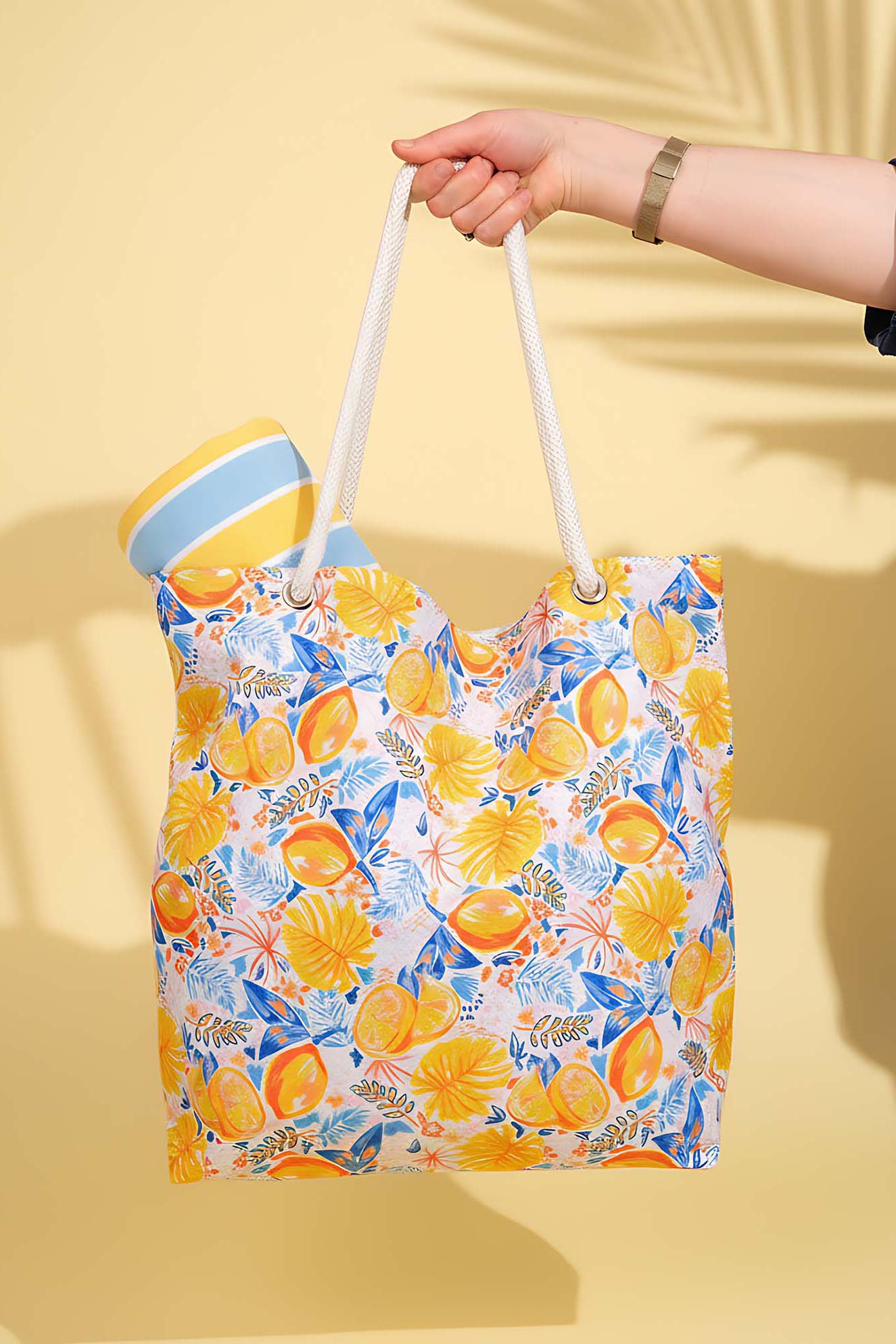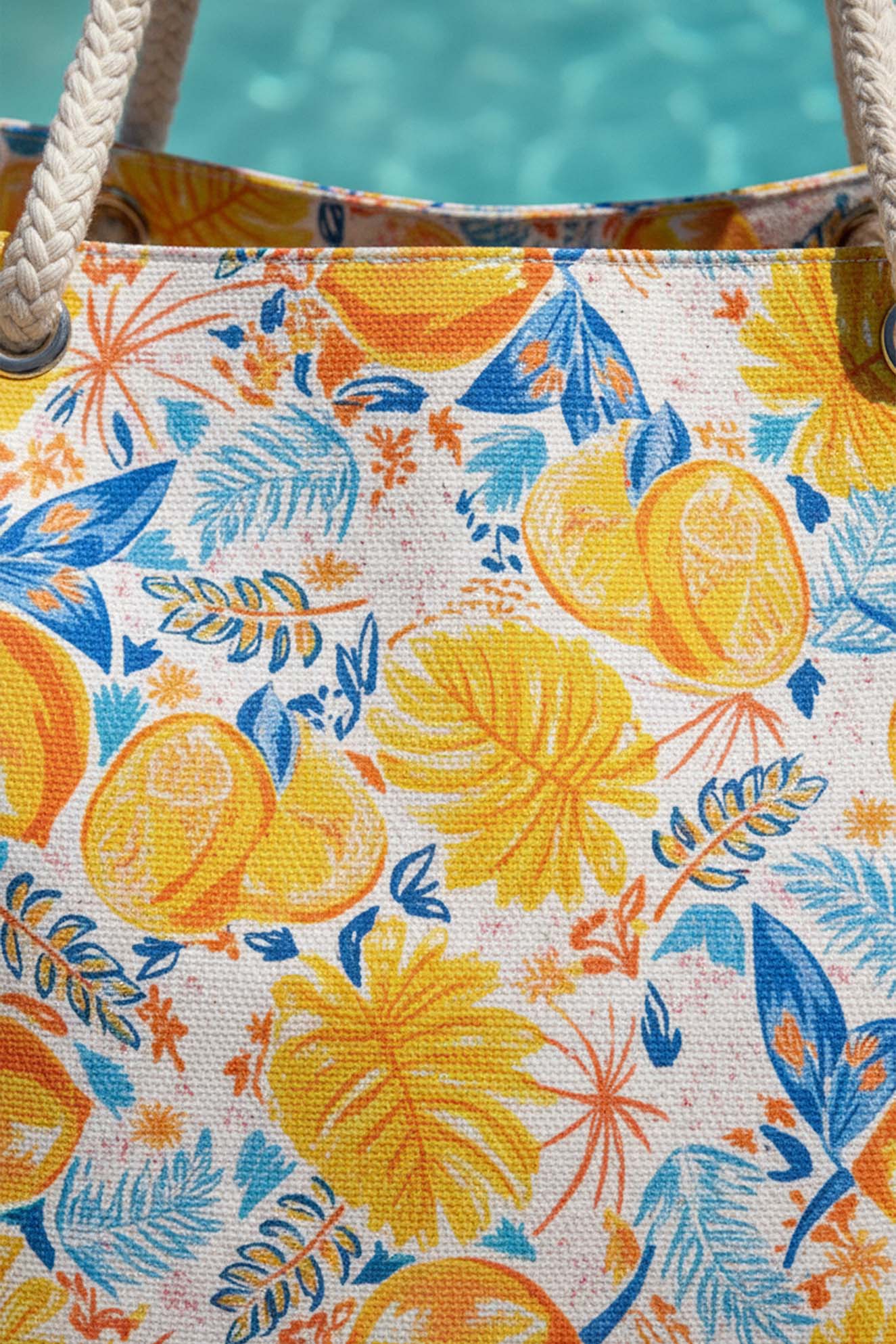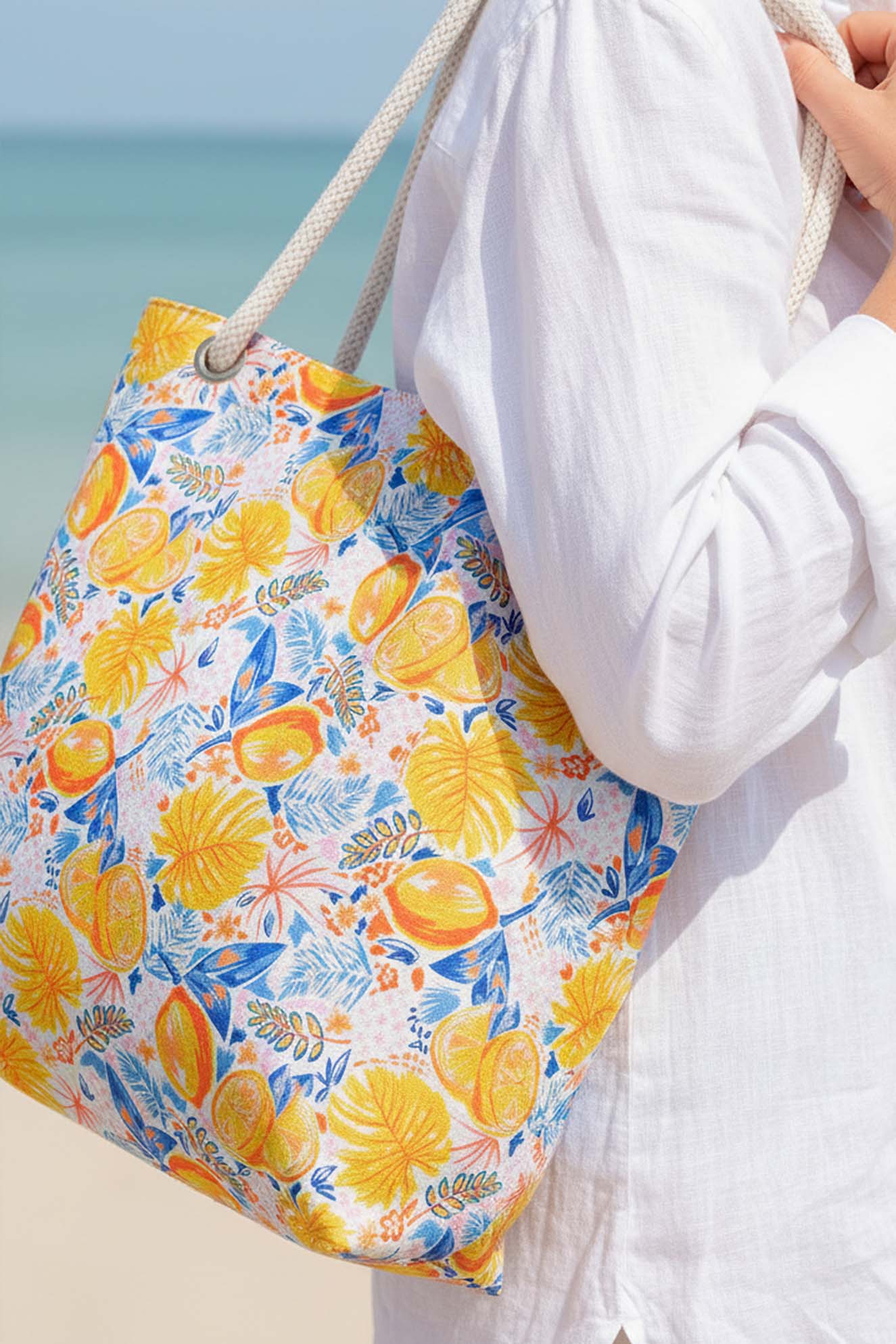 Dayanıklı Oxford su itici kumaştan üretilen plaj çantası, alt kısmındaki 100 gr teta laminasyon sayesinde formunu korur ve uzun süreli kullanım sunar. Limon desenleri ve sağlam ip saplarıyla hem şık hem de kullanışlı bir plaj aksesuarıdır.