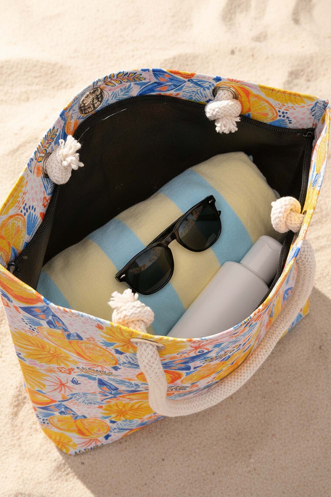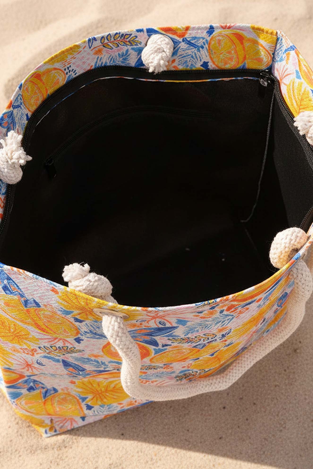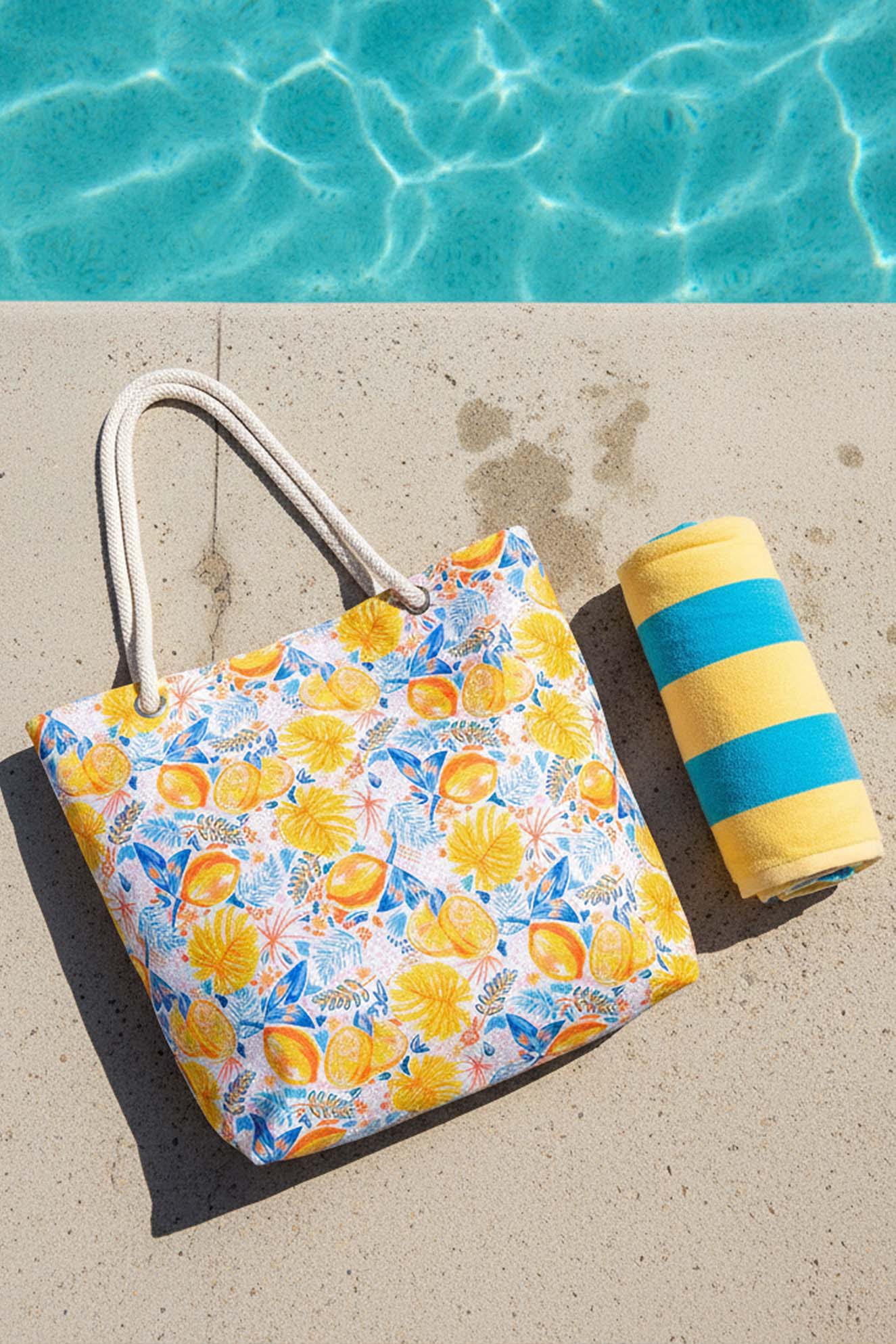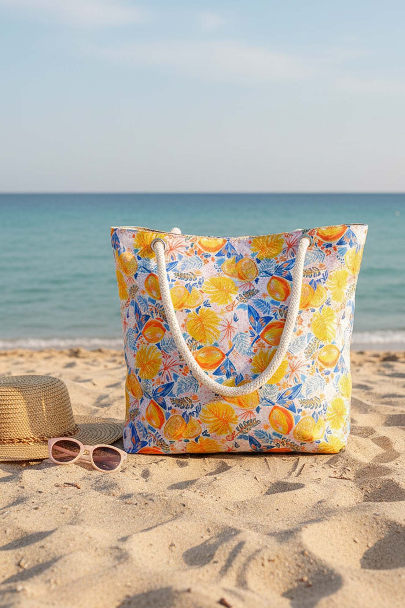 Dayanıklı Oxford su itici kumaştan üretilen plaj çantası, alt kısmındaki 100 gr teta laminasyon sayesinde formunu korur ve uzun süreli kullanım sunar. Limon desenleri ve sağlam ip saplarıyla hem şık hem de kullanışlı bir plaj aksesuarıdır.
