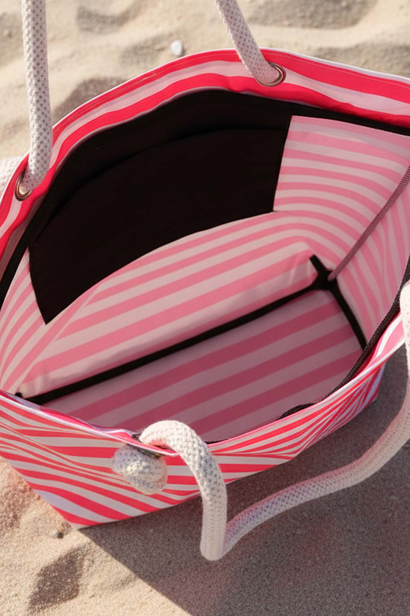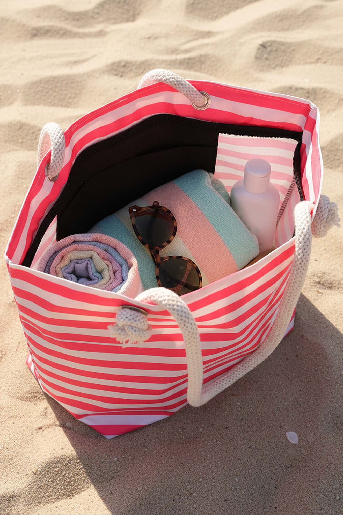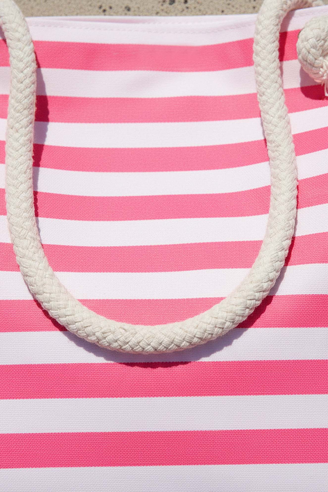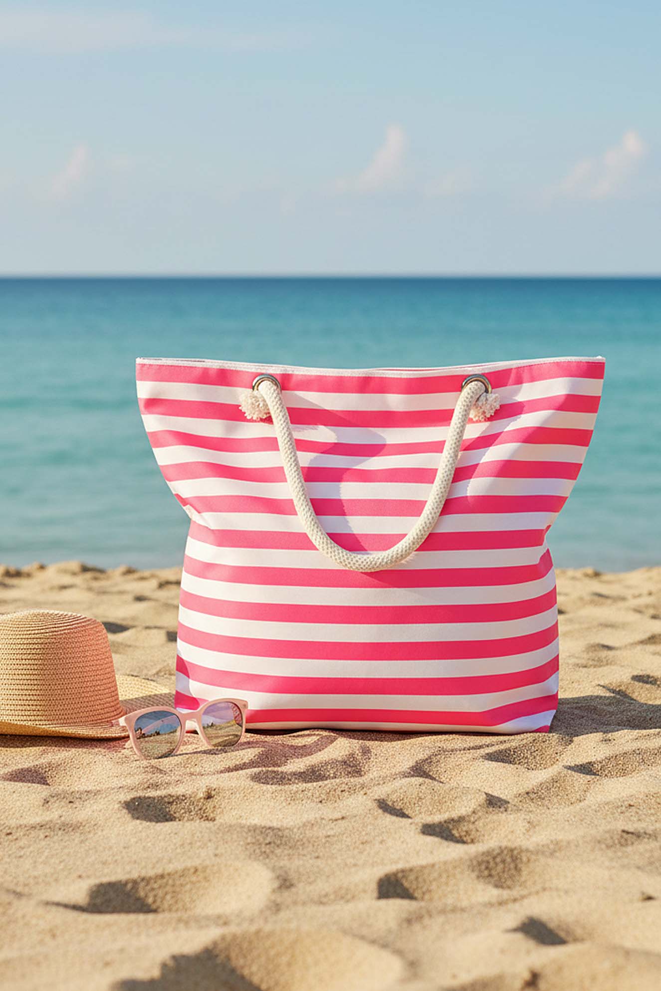Dayanıklı Oxford su itici kumaştan üretilen plaj çantası, alt kısmındaki 100 gr teta laminasyon sayesinde formunu korur ve uzun süreli kullanım sunar. Pembe beyaz çizgili desenleri ve sağlam ip saplarıyla hem şık hem de kullanışlı bir plaj aksesuarıdır.
