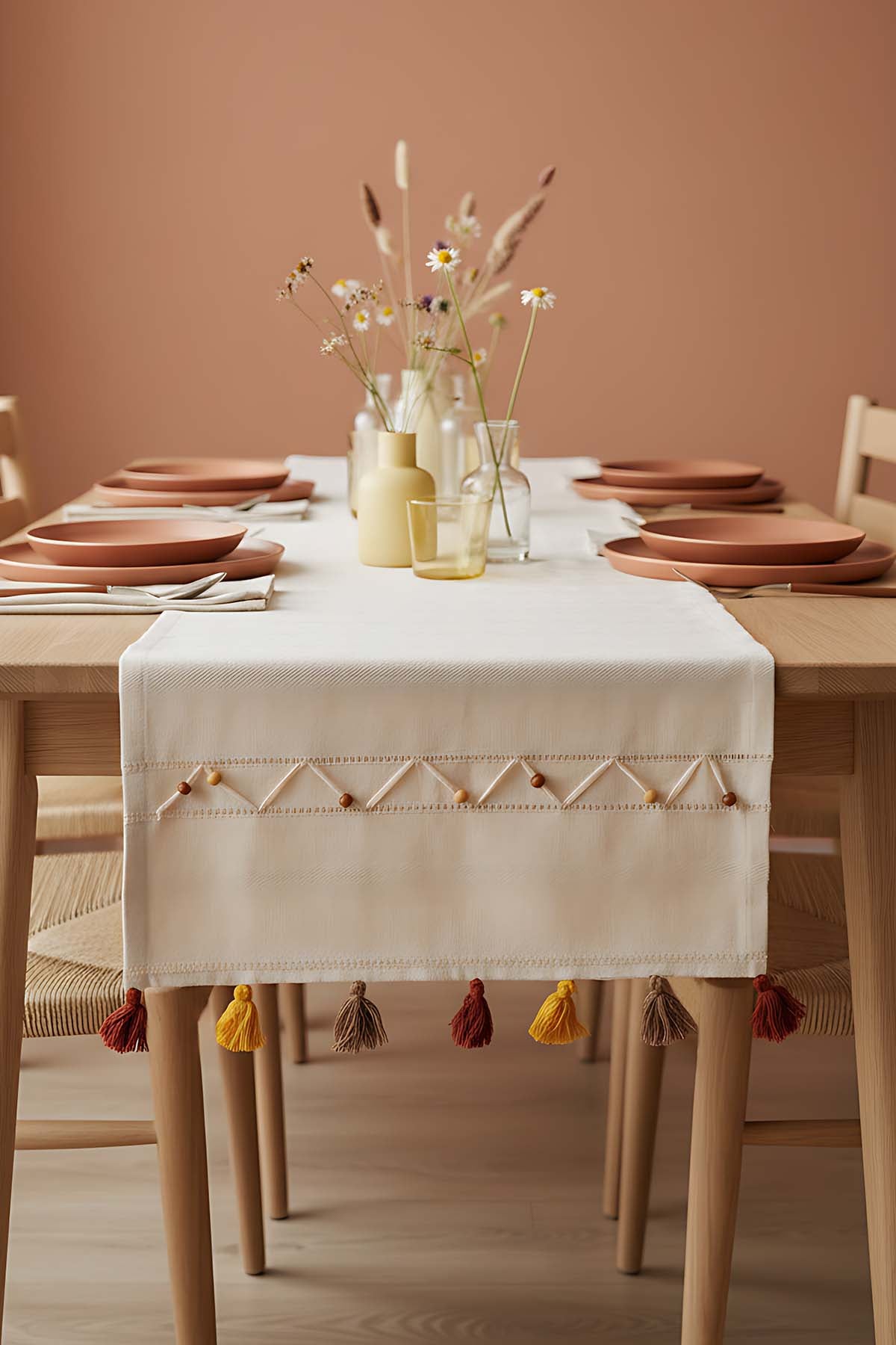 Renk: Açık Krem Ölçü: 50x130 cm Tasarım: Püsküllü kenar detayı ile şık ve yumuşak geçişli görünüm Kullanım Alanı: Yemek masası, dresuar, orta sehpa ve daha fazlası