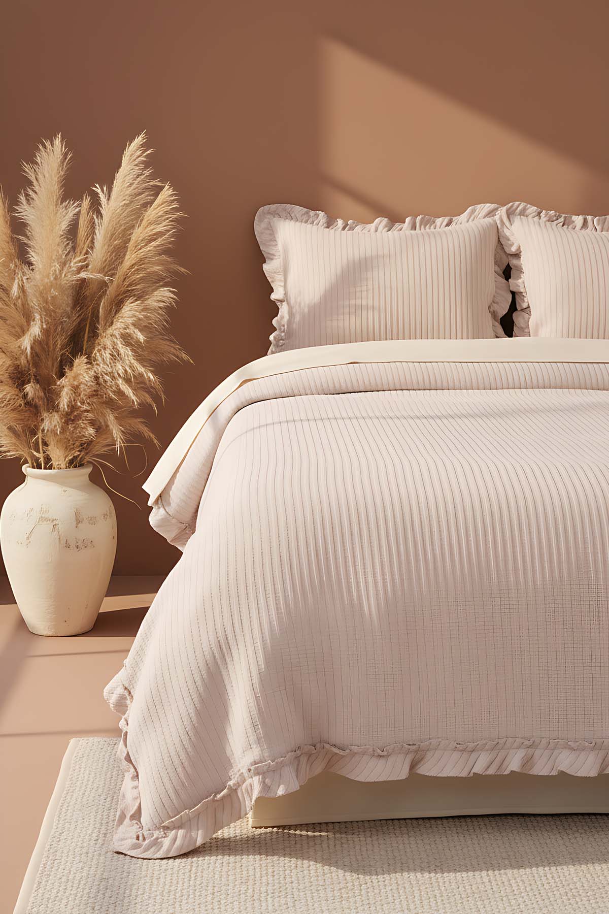 Marta Bej Çift Kişilik %100 Pamuklu Jakarlı Yatak Örtüsü Takımı 3 Parça Uyku Seti
