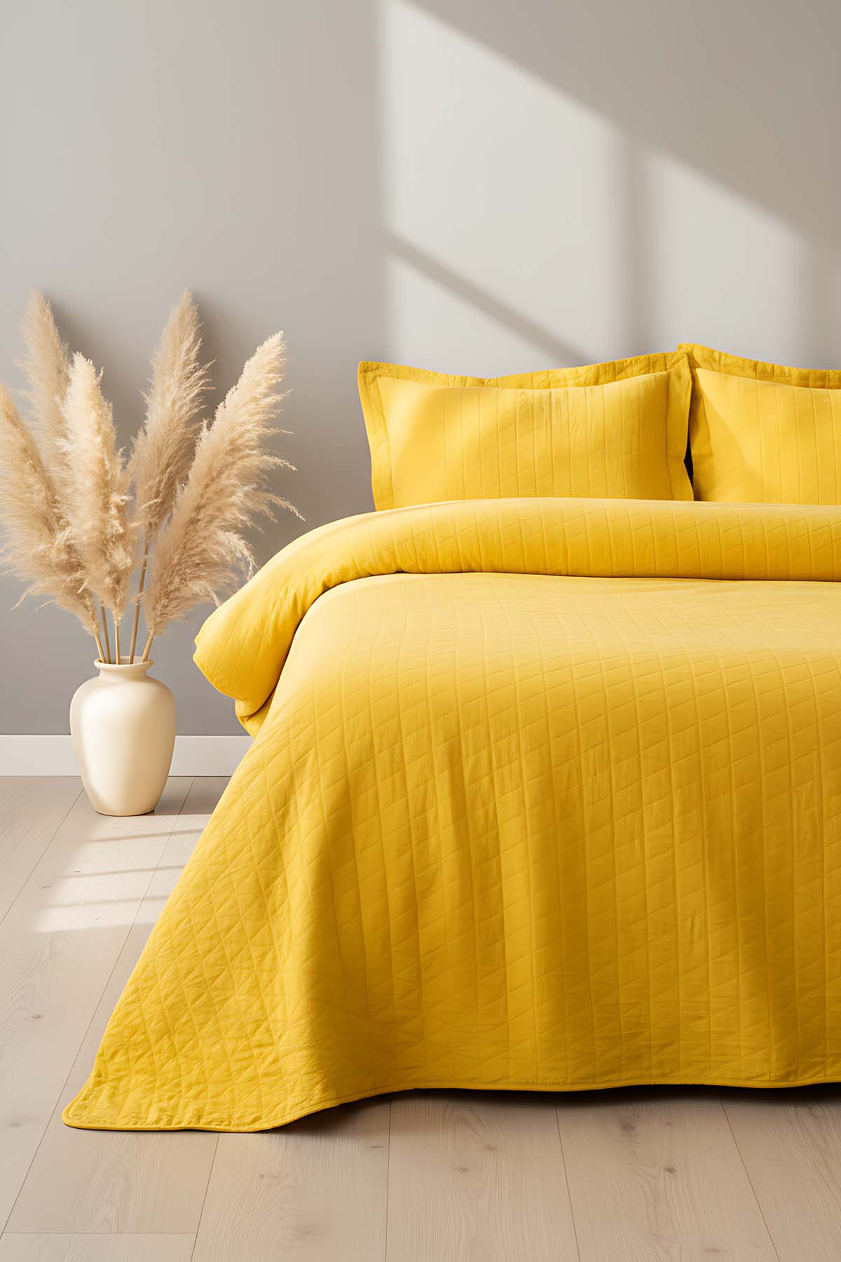 - Orella Sarı Çift Kişilik Jakarlı Yatak Örtüsü Takımı 3 parçadan oluşmaktadır.